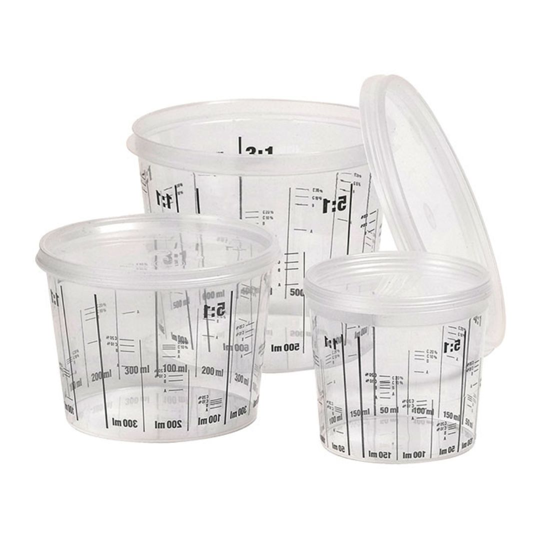 Contenitori graduati monouso per mescolare, dosare e preparare i materiali. Il contenitore è trasparente e resistente ai solventi.