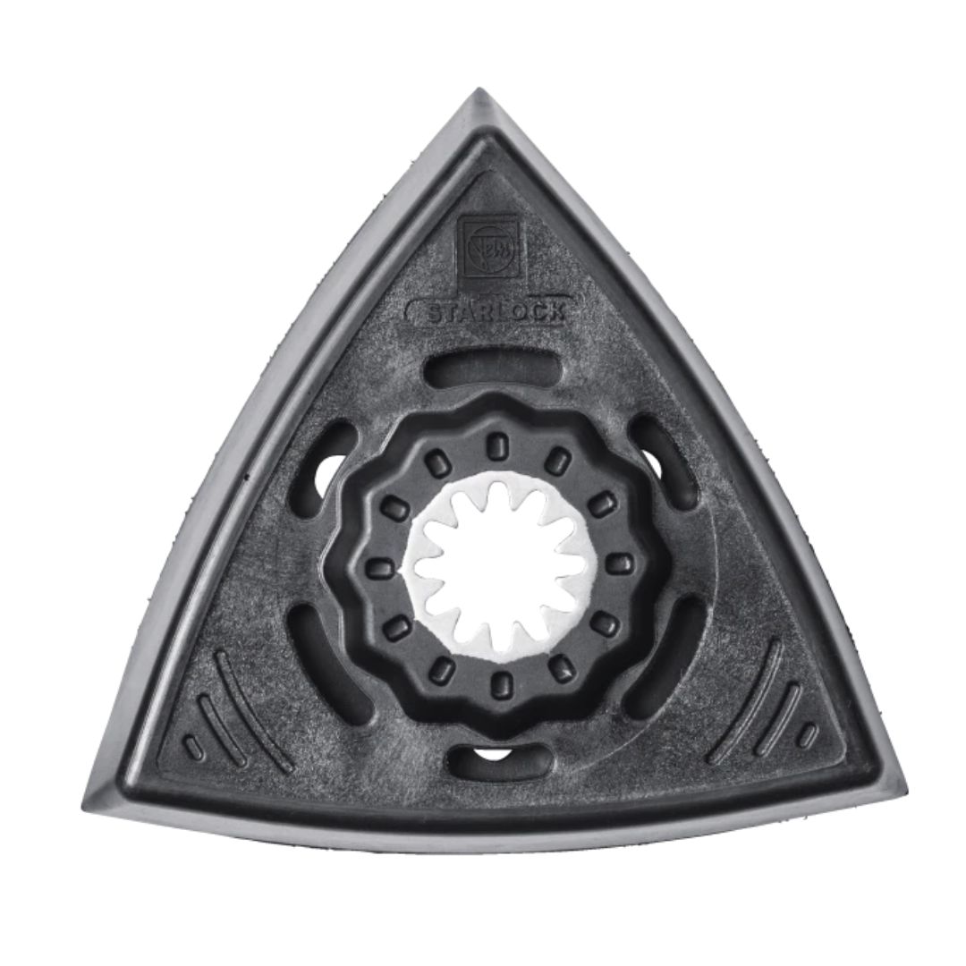 Versione standard per la levigatura con cuffia di aspirazione. Platorello in plastica per evitare danni e marcature sul pezzo in lavorazione. Forma triangolare, versione forata, fissaggio a velcro.